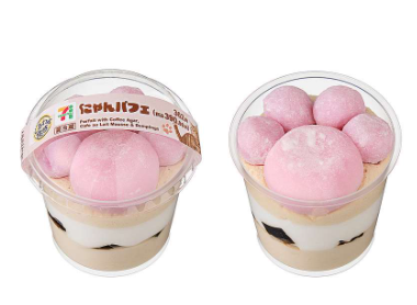 甘いカフェオレムースに、ほろ苦いぷるぷる食感のコーヒー寒天、軽いくちどけのミルクムース、なめらかなカフェオレホイップを重ね、ピンク色の肉球をイメージした団子とミルクあんホイップ大福をトッピング。