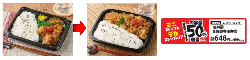 「油淋鶏&麻婆春雨弁当」は、内容量を50%増量。価格は648円。