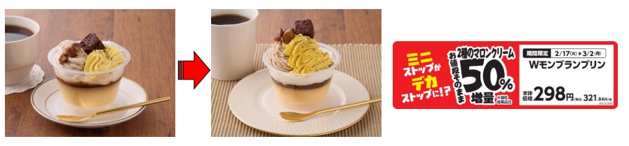 「Wモンブランプリン」は、2種のマロンクリームを50%増量。価格は298円。