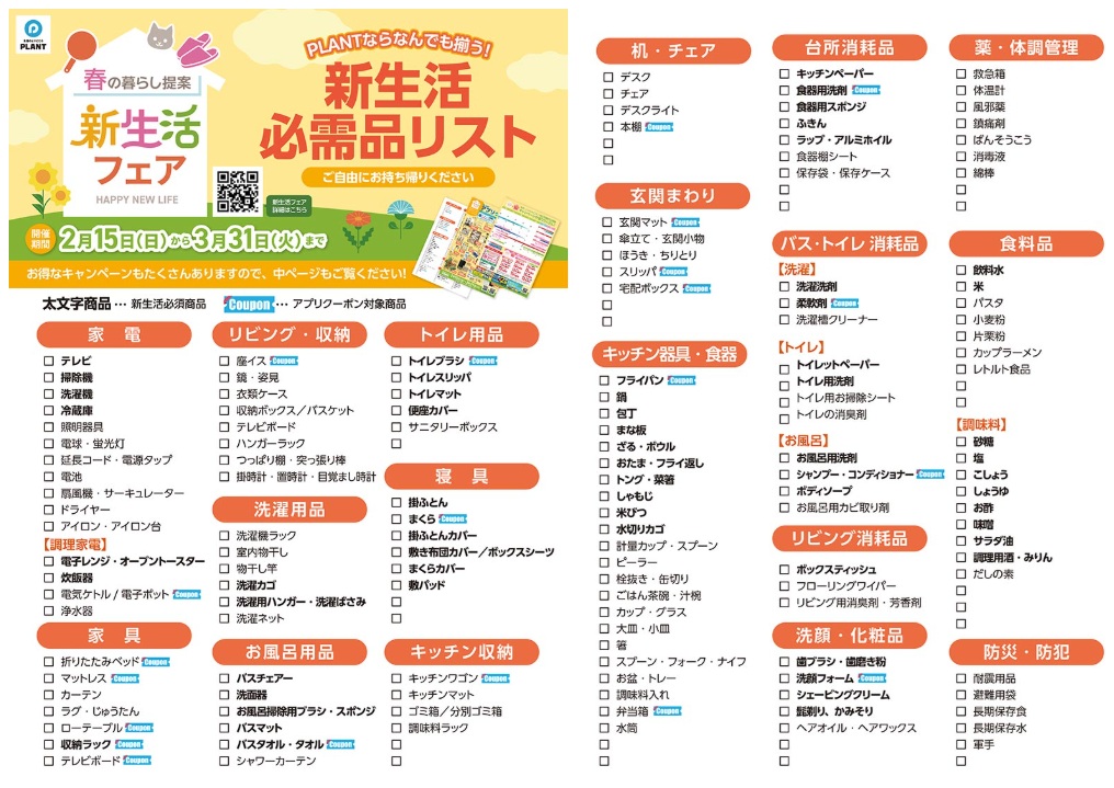 (株)PLANT(福井県坂井市、三ッ田泰二社長)は2月15日(日)から3月31日(火)まで、衣・食・住まるごと新生活を応援する「新生活フェア」を、PLANT全店で開催する。