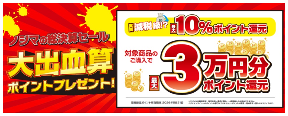 流通スーパーニュース > 販促 > ノジマnews|「減税級!?大出血算(決算)セール」3/31まで開催 ノジマnews|「減税級!?大出血算(決算)セール」3/31まで開催 販促 / 2026年02月25日 ツイート (株)ノジマ(神奈川県横浜市、野島廣司社長)は、政府が検討を進めている食料品の消費税減税に先駆け、「減税級!?大出血算(決算)セール」を開催している。 対象家電の購入で、最大10%のポイント還元や最大5万円での下取りを実施。また出血覚悟の大掘り出し物市では、最大50%OFFの開催や約5000品目の値下げを実施する。そのほか、モバイル会員新規登録で合計1000円分を還元する。 セール開催期間は3月31日(火)まで。 ツイート