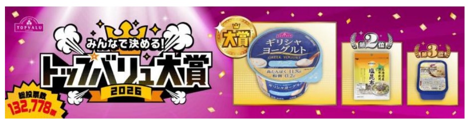 イオン(株)(千葉市美浜区、吉田昭夫社長)は、1~2月にの約1ヵ月間、ノミネート40品目から投票する企画「トップバリュ大賞2026」を開催した。のべ13万2778名が参加し、受賞商品が決定した。