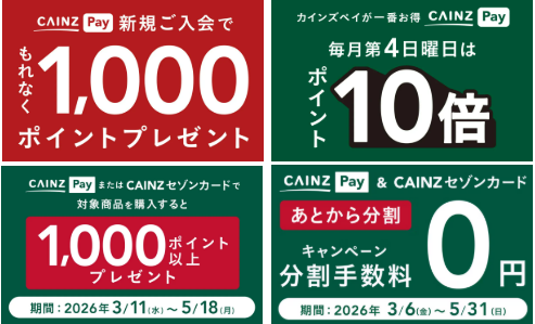 3月1日(日)からは「CAINZ Pay」に新規入会した顧客全員に1000ポイントを付与している。また3月22日の日曜日から、毎月の「お得な買い物日」として「第4日曜」に「CAINZ Pay」を利用して支払うと、ポイント10倍となる。また「CAINZセゾンカード」で決済した場合はポイント8.4倍となる。