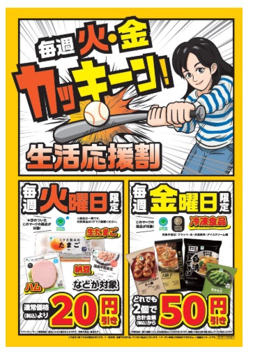 また、毎週金曜日はこれまで同様、冷凍食品2個購入ごと50円引きのセールを継続する。