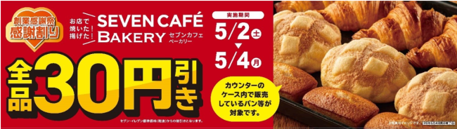 第1弾として、5月2日(土)~4日(月・祝)の3日間、「セブンカフェ ベーカリー」の “お店で焼いた&揚げた” シリーズを対象に、税抜き価格から30円引きする「感謝割り」を行う。