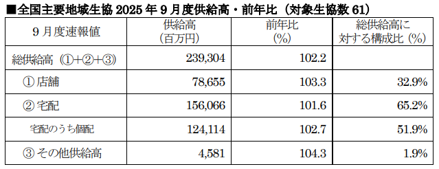 日本生活協同組合連合会(東京都渋谷区、新井ちとせ代表理事会長)が、全国の61主要生協の2025年9月度の供給状況(売上高)を発表した。