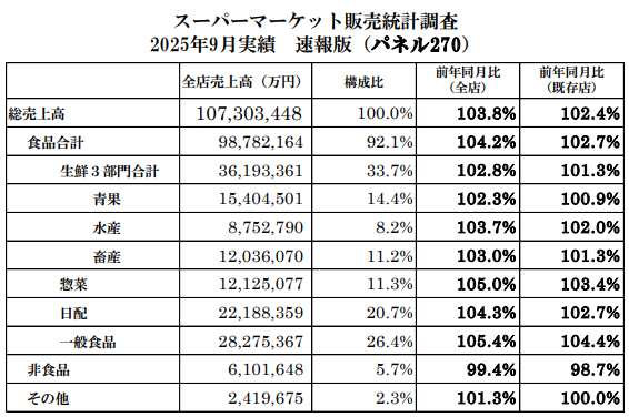 一般社団法人日本スーパーマーケット協会(JSA)、オール日本スーパーマーケット協会(AJS)、一般社団法人全国スーパーマーケット協会(NSAJ)の3団体が、2025年9月の販売実績速報を発表した。9月は3団体会員企業のうち、パネル270社の8403店舗を集計している。