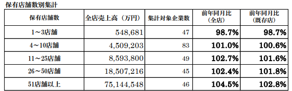 また保有店舗数別では、1~3店舗のみ98.7%と前年を割ったものの、4~10店舗は100.6%、11~25店舗は101.6%、26~50店舗は101.8%、51店舗以上が102.8%となった。