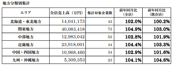 エリア別では、北海道・東北地方が既存店100.2%、関東地方が103.0%、中部地方が101.9%、近畿地方が103.3%、中国・四国地方が101.6%、九州・沖縄地方が104.6%と、全エリアで前年をクリアした。