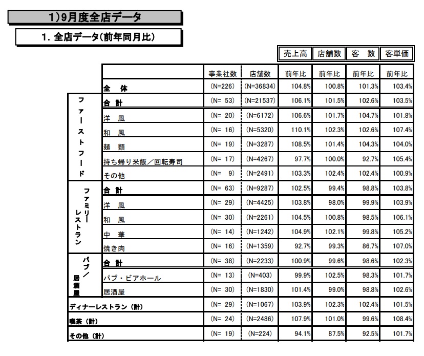 9月外食統計|全店売上高4.8%増/客数減少も客単価上昇で堅調