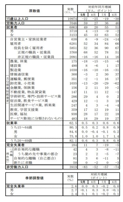 総務省統計局が2025年9月の「労働力調査」を発表した。