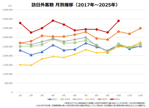 日本政府観光局(JNTO)が発表した2025年10月の訪⽇外客数は 389万6300人で、前年同月比17.6%増加した。10月として過去最高記録を更新した。