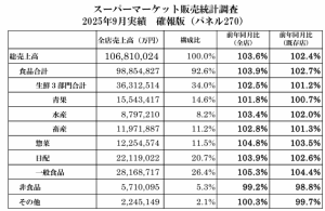 一般社団法人日本スーパーマーケット協会(JSA)、オール日本スーパーマーケット協会(AJS)、一般社団法人全国スーパーマーケット協会(NSAJ)の3団体が、2025年10月の販売実績速報を発表した。10月は3団体会員企業のうち、パネル270社の8412店舗を集計している。
