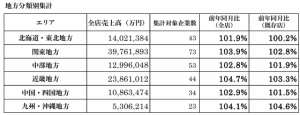 エリア別では、北海道・東北地方が既存店100.2%、関東地方が102.8%、中部地方が101.9%、近畿地方が103.3%、中国・四国地方が101.5%、九州・沖縄地方が104.6%と、全エリアで前年をクリアした。