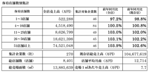また保有店舗数別では、1~3店舗のみ98.8%と前年を割ったものの、4~10店舗は100.8%、11~25店舗は102.0%、26~50店舗は102.2%、51店舗以上が102.6%となった。