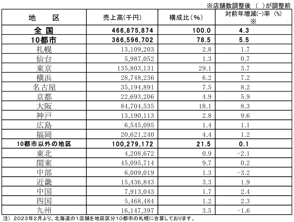 地区別では売上げの78.5%を占める主要10都市で、5.5%増だった。10都市すべてでプラスとなった。また地方(10都市以外の7地区)では、0.1%増。東北、中部、九州でマイナスとなった。