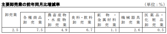 業が6.7%増、農畜産物・水産物卸売業が4.9%増、機械器具卸売業が2.6%増、建築材料卸売業が1.1%増、鉱物・金属材料卸売業が1.1%増、医薬品・化粧品卸売業が0.5%増となった。