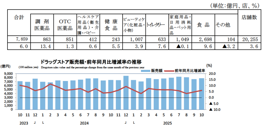 ドラッグストアの販売額は7859億円で6.0%増。