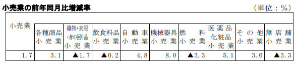 一方、燃料小売業が3.3%減、無店舗小売業が3.3%減、織物・衣服・