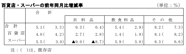 百貨店・スーパー販売額は1兆8810億円で5.1%増加した。うち、百貨店は5108億円の0.4%増、スーパーは1兆3702億円の5.5%増となった。 商品別では、衣料品は0.3%増、飲食料品は5.4%増、その他は8.2%増となった。