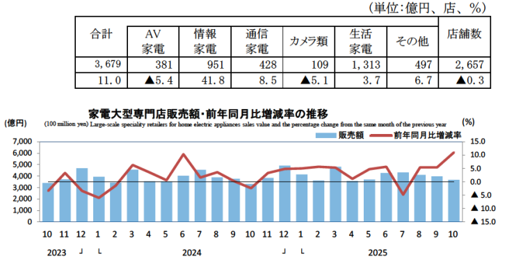 家電大型専門店の販売額は3679億円で11.0%増。