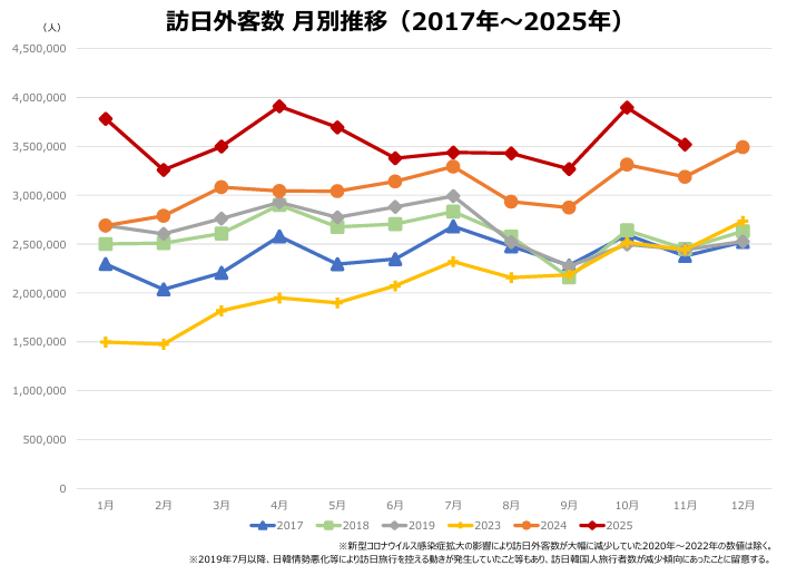 日本政府観光局(JNTO)が発表した2025年11月の訪⽇外客数は 351万8000人で、前年同月比10.4%増加した。