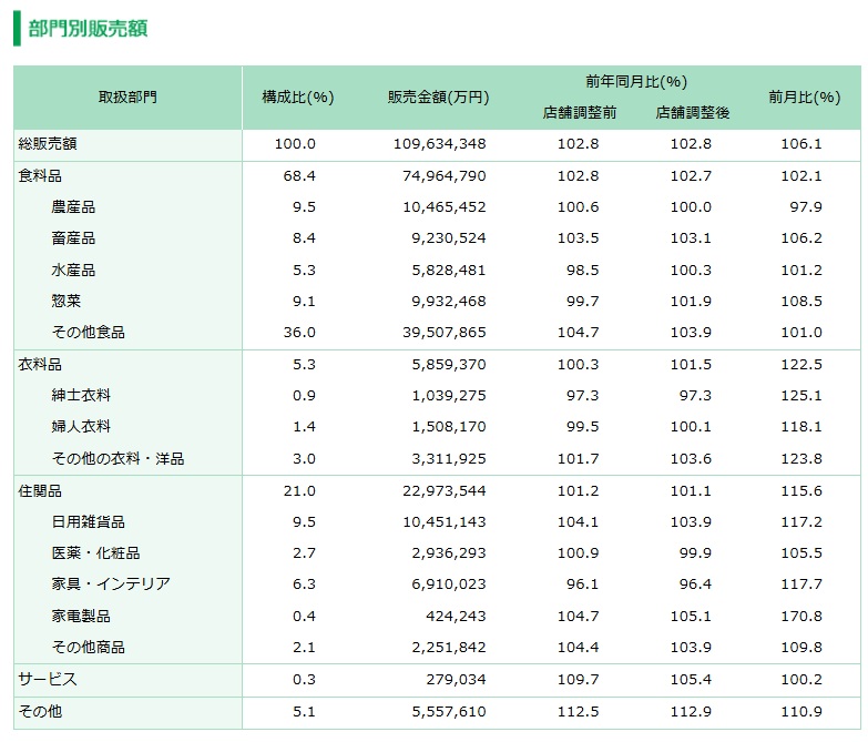 部門別売上高は、食料品が7496億4790万円で既存店102.7%。住関品は2297億3544万円で101.1%、衣料品は585億9370万円で101.5%。「サービス」は27億9034万円で105.4%、「その他」は555億7610万円で112.9%だった。