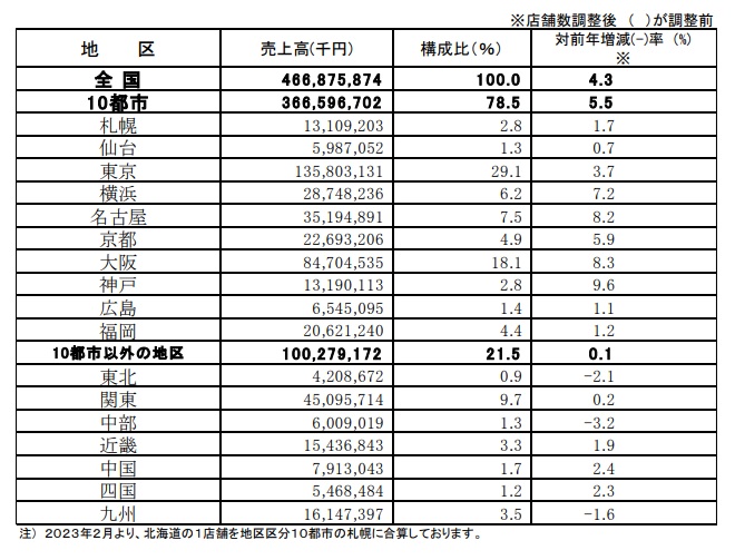 地区別では売上げの77.5%を占める主要10都市で、1.2%増だった。6地区で対前年プラスとなった。また地方(10都市以外の7地区)では、0.2%減。東北、関東、中部、九州でマイナスとなった。