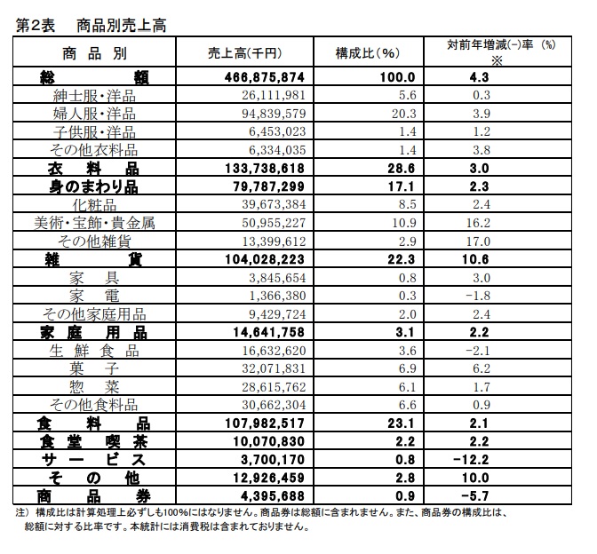 商品別売上高は主要5品目のうち、衣料品、雑貨、食料品の3 品目は前年実績をクリアした。主力の「衣料品」は、気温低下に伴い、コート、ブルゾンなど冬物アウター類が紳士、婦人共に好調だった。「身のまわり品」は、好不調に地域差があり、改装や催事効果が見られる店舗ではラグジュアリーブランドを中心に売上を伸ばした。化粧品と美術・宝飾・貴金属が堅調に推移した。