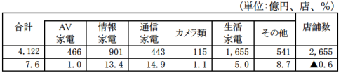 家電大型専門店販売額は4122億円、前年同月比7.6%の増加となった。商品別では、AV家電は、オーディオ家電が同4.3%の増加、ビジュアル家電が同0.2%の減少となったため、AV家電全体では1.0%の増加となった。情報家電は、情報家電本体が20.1%増、情報家電周辺機器が5.6%増となった。情報家電全体では13.4%増となった。通信家電は14.9%増となった。カメラ類は1.1%増となった。