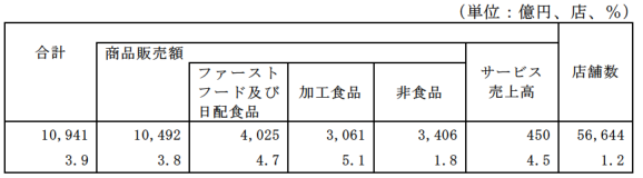 コンビニエンスストアの商品販売額およびサービス売上高は、1兆0941億円、前年同月比3.9%の増加となった。商品別にみるとファーストフード・日配食品が4025億円、4.7%増、加工食品が3061億円、5.1%増、非食品が3406億円、1.8%増となったため、商品販売額は1兆0492億円、3.8%の増加となった。サービス売上高は450億円、4.5%増となった。