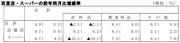 スーパーの動向では衣料品は、身の回り品が12.4%の減少、婦人・子供服・洋品が11.0%の減少、紳士服・洋品が9.3%の減少、その他の衣料品が7.5%の減少となったため、衣料品全体では10.5%の減少となった。主力商品である飲食料品は7.4%増となった。