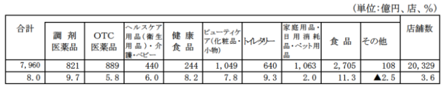 ドラッグストア販売額は7960億円、前年同月比でみると 8.0%の増加となった。商品別は、食品が11.3%の増加、調剤医薬品が9.7%の増加、トイレタリーが9.3%の増加、健康食品が8.2%の増加、ビューティケア(化粧品・小物)が7.8%増、ヘルスケア用品(衛生用品)・介護・ベビーが6.0%増、OTC医薬品が5.8%増、家庭用品・日用消耗品・ペット用品が2.0%の増加となった。その他が2.5%の減少となった。
