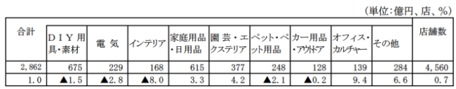 ホームセンター販売額は2862億円、前年同月比1.0%の増加となった。商品別では、オフィス・カルチャーが9.4%増、その他が6.6%の増加、園芸・エクステリアが4.2%増、家庭用品・日用品が3.3%増となった。一方、インテリアが8.0%の減少、電気が2.8%の減少、ペット・ペット用品が2.1%の減少、DIY用具・素材が1.5%の減少、カー用品・アウトドアが同 0.2%減少となった。