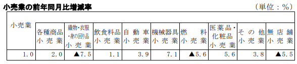 小売業は、機械器具小売業が7.1%の増加、医薬品・化粧品小売業が5.6%増、自動車小売業が3.9%増、その他小売業が同3.8%増、各種商品小売業(百貨店など)が2.0%の増、飲食料品小売業が1.1%の増となった。一方、織物・衣服・身の回り品小売業が7.5%減、燃料小売業が5.6%減、無店舗小売業が5.5%減となった。