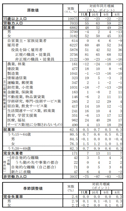 11月の就業者数は6862万人で前年同月に比べて48万人増加した。40カ月連続で増加している。就業率は62.5%、15~64歳の就業率は80.5%。