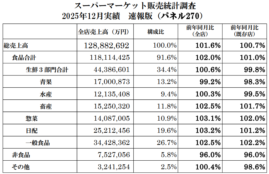 一般社団法人日本スーパーマーケット協会(JSA)、オール日本スーパーマーケット協会(AJS)、一般社団法人全国スーパーマーケット協会(NSAJ)の3団体が、2025年12月の販売実績速報を発表した。12月は3団体会員企業のうち、パネル270社の8422店舗を集計している。