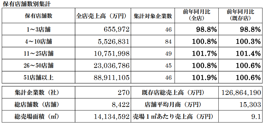 また保有店舗数別では、1~3店舗が98.8%、4~10店舗は100.3%、11~25店舗は101.4%、26~50店舗は100.6%、51店舗以上が100.6%となった。