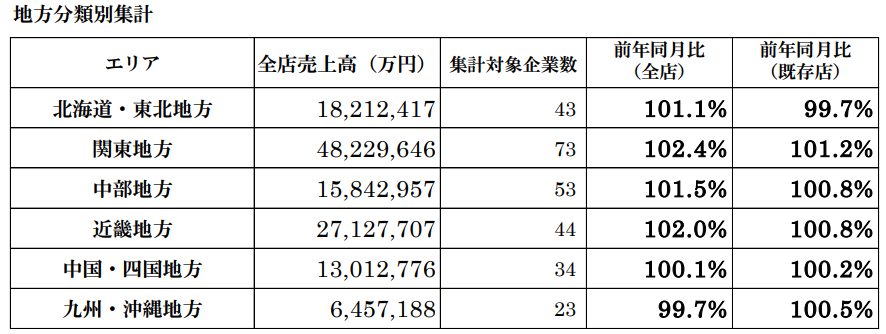 エリア別では、北海道・東北地方が既存店99.7%、関東地方が101.2%、中部地方が100.8%、近畿地方が100.8%、中国・四国地方が100.2%、九州・沖縄地方が100.5%と、北海道・東北地方を除くエリアで前年をクリアした。