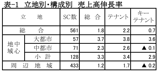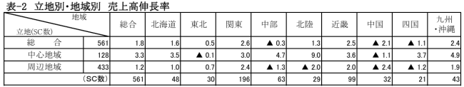 立地別に見ると、中心地域は総合で3.3%増、周辺地域は1.2%増加した。中心地域はリニューアルやテナントの入れ替え効果のあったSCがとくに好調だった。周辺地域はテナントの退店があったSCやインバウンドの来館が減少したSCが伸び悩んだ。