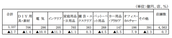 ホームセンター販売額は 3337 億円、前年同月比でみると 2.7%減となった。商品別にみると、インテリアが同11.3%減、電気が 10.0%減少、カー用品・アウトドアが 5.5%減少、ペット・ペット用品が4.5%減、その他が同2.3%減、DIY用具・素材が1.4%減、家庭用品・日用品が同 1.1%減となった。オフィス・カルチャーが7.9%増、園芸・エクステリアが0.3%増加となった。