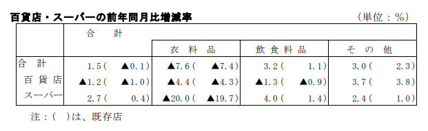百貨店・スーパー販売額は2兆3828億円、前年同月比1.5%増。百貨店は7147億円、1.2%減、スーパーは1兆6681億円、2.7%増となった。商品別では、衣料品は7.6%減、飲食料品は3.2%増、その他は3.0%増となった。