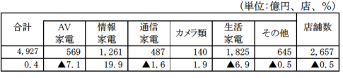 家電大型専門店販売額は4927億円、前年同月比0.4%増となった。商品別ではAV家電は、ビジュアル家電が8.1%減、オーディオ家電が4.6%減となったため、AV家電全体では同7.1%減となった。情報家電は、情報家電本体が35.5%増、情報家電周辺機器が 2.8%増となったため、情報家電全体では19.9%増となった。通信家電は同1.6%減となった。カメラ類は1.9%増となった。生活家電は、季節家電が12.6%減、家事家電が7.1%減、調理家電が4.8%減、理美容家電が1.7%増となったため、生活家電全体では6.9%減となった。