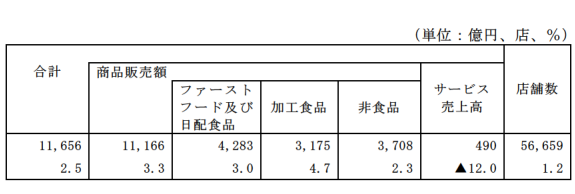 コンビニエンスストアの商品販売額及びサービス売上高は、1兆1656億円、前年同月比2.5%増となった。商品別にみるとファーストフード・日配食品が4283億円、3.0%増、加工食品が3175億円、4.7%増、非食品が3708億円、2.3%増となったため、商品販売額は1兆1166億円、3.3%増となった。サービス売上高は490億円、12.0%減となった。2025年のコンビニエンスストアの商品販売額及びサービス売上高は、13兆3212億円、前年比3.4%増となった。