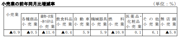 小売業を業種別にみると、織物・衣服・身の回り品小売業が前年同月比11.6%減、燃料小売業が10.8%減、無店舗小売業が5.8%減、各種商品小売業(百貨店など)が0.5%減、飲食料品小売業が0.4%減となった。その他小売業は6.1%増、自動車小売業は5.9%増、機械器具小売業が5.9%増、医薬品・化粧品小売業が0.1%増となった。