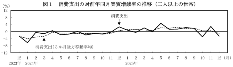 12月家計調査|消費支出1世帯当たり35.2万円で前年同月比実質2.6%減
