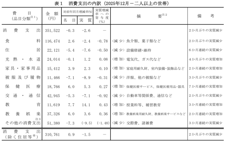 12月の消費支出(二人以上の世帯)は、1世帯当たり35万1522円。前年同月比は実質2.6%減、名目0.3%減だった。季節調整値では前月比実質2.9%減少している。