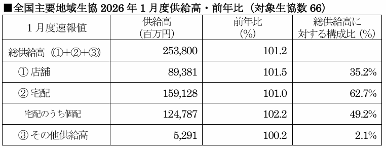 日本生活協同組合連合会(東京都渋谷区、新井ちとせ代表理事会長)が、全国の66主要生協の2026年1月度の供給状況(売上高)を発表した。