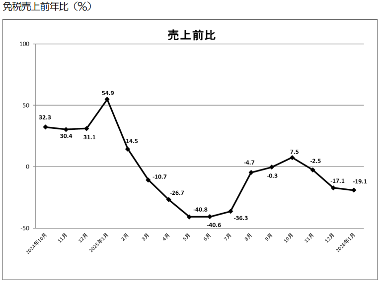 (一社)日本百貨店協会(東京都中央区、好本達也会長)のインバウンド推進委員会が、2026年1月の外国人観光客の「免税売上高・来店動向」を発表した。調査対象はインバウンド推進委員店の86店舗。先月より1店舗減っている。