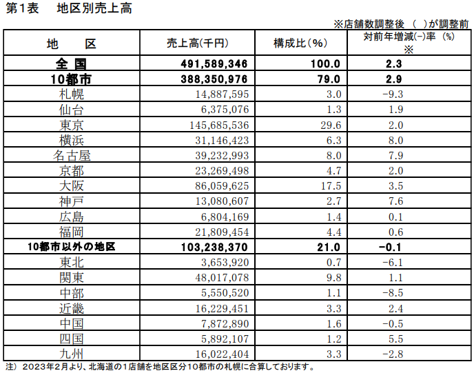 地区別では売上げの79.0%を占める「主要10都市」で2.9%増加した。対前年マイナスだったのは札幌の9.3%減のみ。